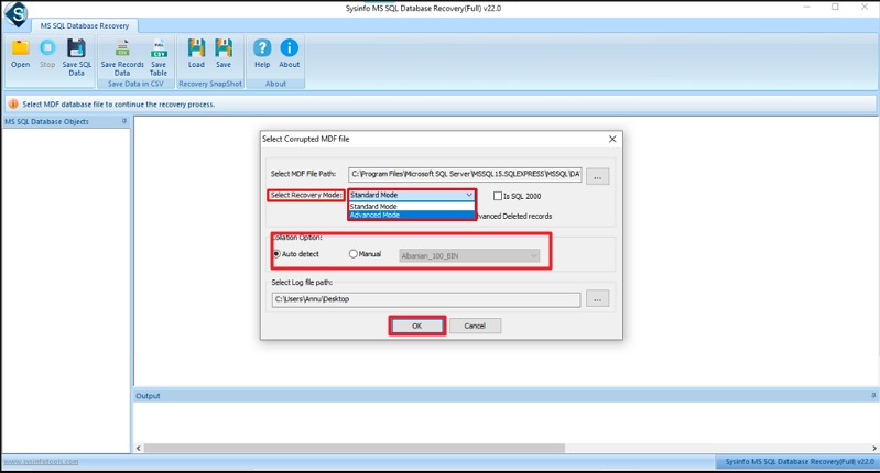 Different modes are available to Fix SQL Database in Recovery Mode, i.e. Standard Mode for minor corruption issues and Advanced Mode if corruption is moderate or severe and can't be fixed in Standard Mode.